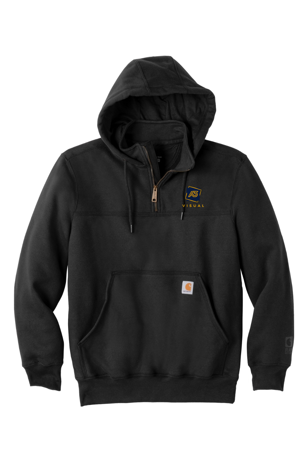 Rain Defender durable water-repellent technology has your back all day, every day in this rugged mock sweatshirt that stands up to weather and tough jobs.. 13-ounce, 75/25 cotton/poly blend or 55/45 cotton/poly blend with Rain Defender durable water-repellent finish (Black, New Navy)*. 55/45 cotton/poly blend (Carbon Heather). Attached jersey-lined three-piece hood with drawcord closure. Mock neck collar with 8-inch antique-finish brass zipper. Front hand warmer pocket with hidden security pocket inside. Stretchable, spandex-reinforced, rib knit cuffs and waistband. Carhartt label sewn on hand warmer pocket.