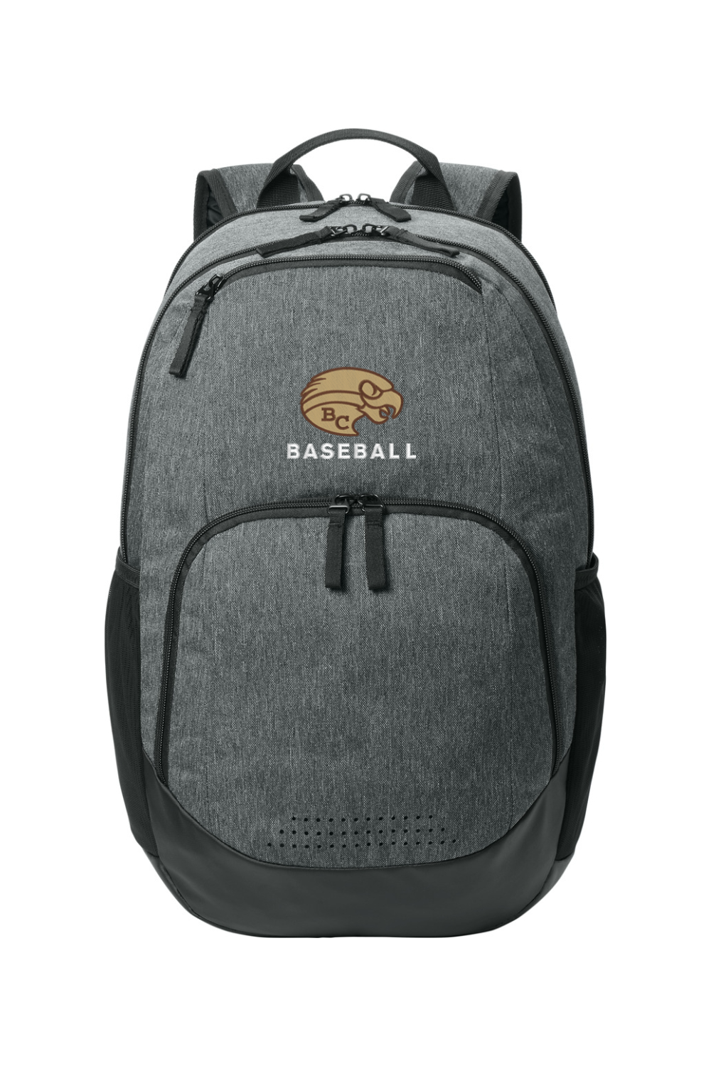 600D poly PVC/600D dobby poly PVC. Dedicated back laptop compartment. Padded back. Air vent shoe or ball compartment. Adjustable padded shoulder straps. Side mesh pockets. Matte coated zippers. Matte metal zipper pulls. Integrated carry handle. Laptop compartment dimensions: 17.5"h x 12"w x 1"d; fits most 17" laptops. Dimensions: 19"h x 12.5"w x 7.5"d. Capacity: 1,709 cu. in./28 L. Weight: 1.235 lbs./0.56 kg. Note: Bags not intended for use by children 12 and under.